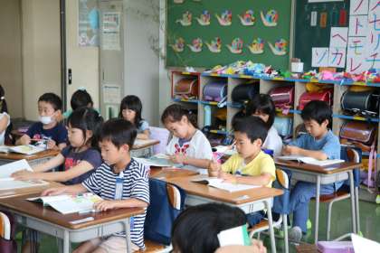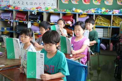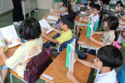 1年生国語「大きなかぶ」の学習の様子です。席の列ごとに音読しています。登場人物が出てくるたびに、子どもたちは大喜びです。