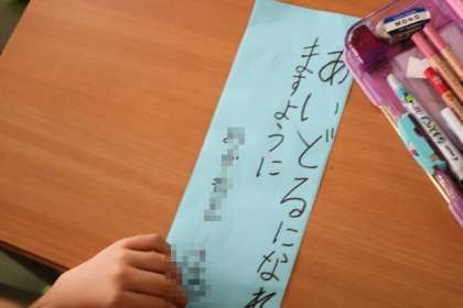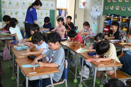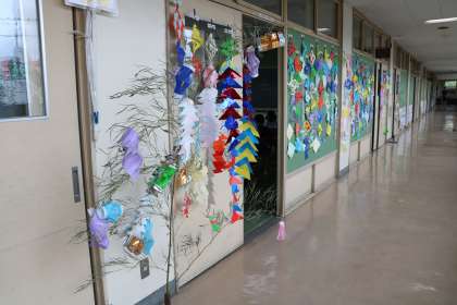 1年生が七夕飾りの願い事を書いていました。各教室の前は笹飾りが飾られています。