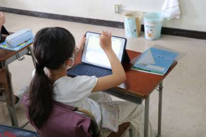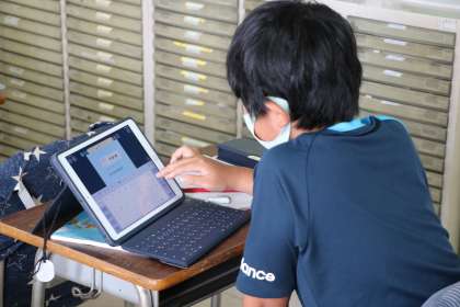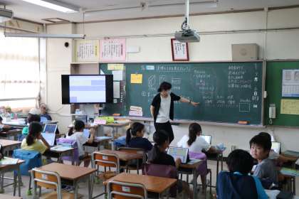 4年生の算数の授業の様子です。見積もりの仕方について学習していました。今日は自分の考えをロイロノートに書いて、大型テレビでみんなの考えを見合っていました。自分と同じ考え方だけでなく違う考え方もあることを確認できていました。