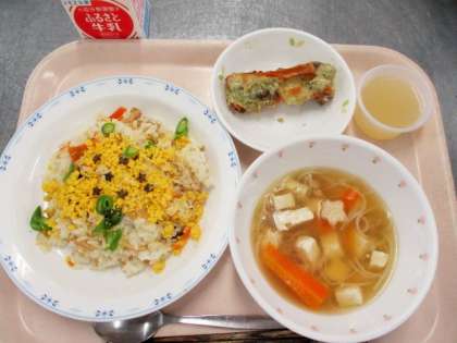 今日の給食は七夕の行事食です。七夕の日には、そうめんを食べる風習がありますが、