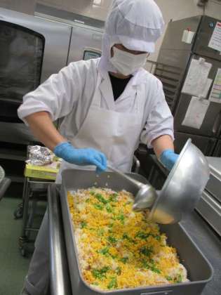 ちらし寿司はかんぴょう、油揚げなどの具から手作りしています。上にかけるのりも星形にしてあります。写真は炒り卵を作っている様子です。20分以上、卵を火にかけ炒り続けて作ります。