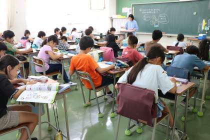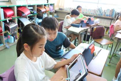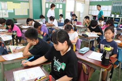 4年生、社会、社会、日本語の様子です。タブレットを適切に使い落ち着いて学習しています。