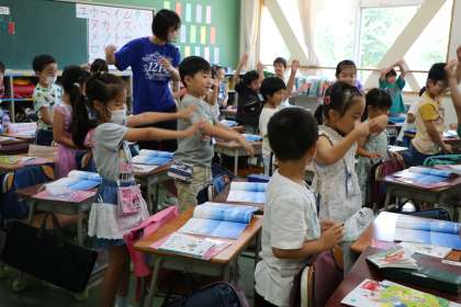 1年生音楽の様子です。「海は広いな 大きいな・・・」とすてきな歌声が聞こえてきました。曲に合わせて自然と体が動く子が何人もいたので、先生が