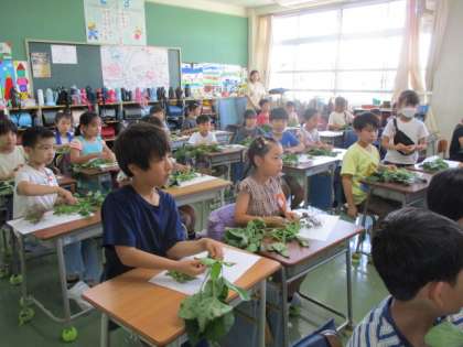 今日は2年生が砧小学校全員分の枝豆のさやもぎをしてくれました。「砧小学校全員分の給食になるよ」と伝えると、丁寧にひとつひとつ枝からとっていました。もいだ枝豆は給食室までクラス全員で届けてくれました。「おいしい給食にしてください!」とこどもたちから渡された後、給食室ではきれいに洗って、ゆでて給食に間に合うように調理しました。世田谷区でとれた「せたがやそだち」の枝豆です。2年生のみなさん、ありがとうございました!