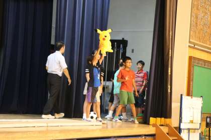 最後の問題は「幕の間を通ったのは誰でしょう?」です。正解しようと必死で見る子どもたち。舞台裏も必死です。さあ、誰先生だったでしょうか?