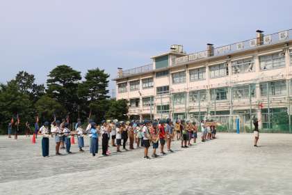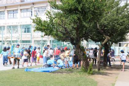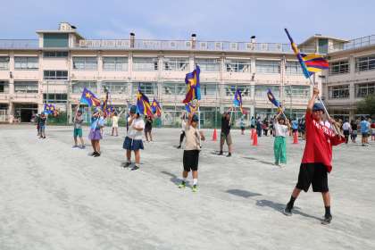 6年生の様子です。いよいよ「砧っ子夏祭り」を4日後に控え最後の全来練習です。1時間目とはいえもうすでにかなり熱くなっているので、短時間で、曲の演奏は上手なので、歩き方とか演奏開始のタイミングとか流れを一通り練習しました。もうこれでばっちりです。土曜日、第58代鼓笛隊の最後の演奏が楽しみです。