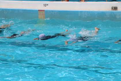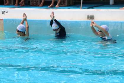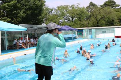 水に入っていても水分補給をしっかりし、見学の子たちも足に水をかけてもらい、熱中症対策に気を付けています。