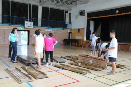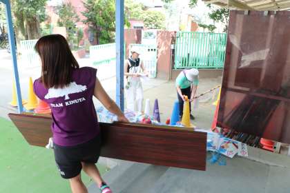 明日の砧っ子夏祭り準備の様子です。保護者の皆さんと、午前中は個人面談だった先生一緒に準備にあたっています。