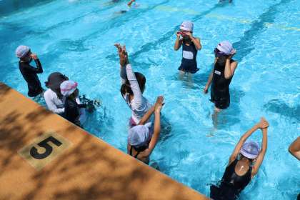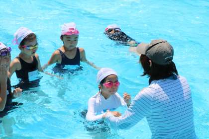 担任の先生も、面談の合間にプールに来てくれました。け伸びのポイントを確認しながら練習です。