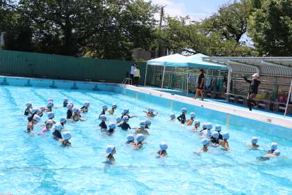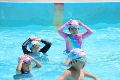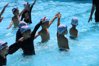 1年生水慣れの様子です。音楽に合わせてリズム泳をやっています。
