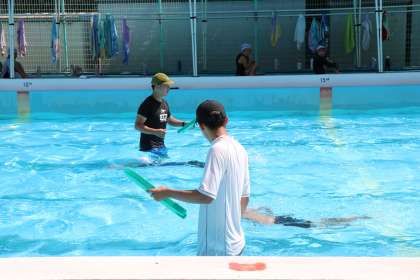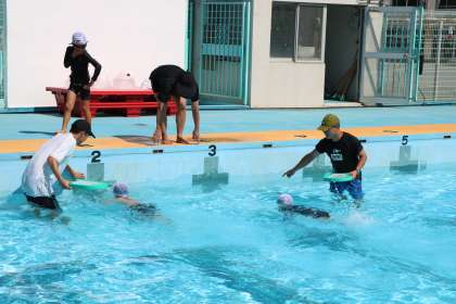 赤色級の検定が終わったら、黄色級の検定です。各コースに先生が付いて声をかけてくれますし、プールサイドからも大きな声援が聞こえます。みんなの声が力になります。