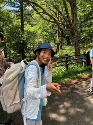 湯の湖で学年写真を撮ってからハイキングスタートです!指にとまったトンボもいっしょにハイキングに連れて行きます!
