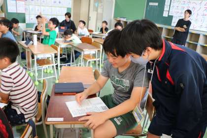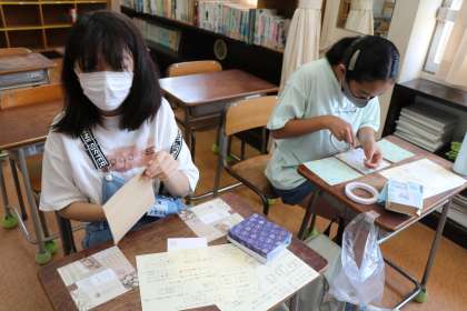 デザインペーパーで作る紙袋は、身近に手に入る材料でできる楽しい企画です。中学生になった卒業生も手伝いに来てくれました。