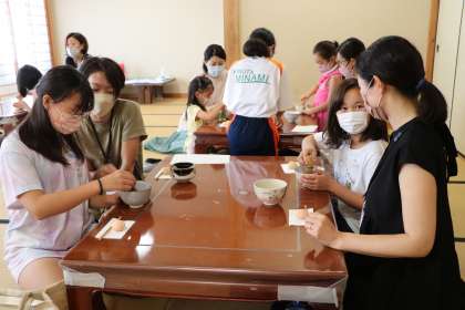 「親子で気軽にテーブル茶道」の様子です。先生の「ラテのように泡を立てます・・・」の言葉に、「あ〜わかりやすい。ラテみたいにするのね。」と言う子がいました。とてもわかりやすい説明に楽しく気軽に楽しむことができたようです。