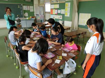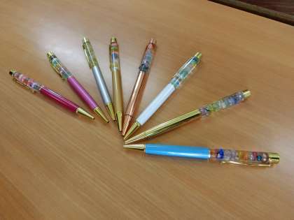 ボールペンの中にビーズを入れて、オリジナルのボールペンを作りました。どんな色や大きさのビーズを選ぶか、どんな順番で入れるか、それぞれがデザインをじっくり考えました。すてきな、自分だけのボールペンが完成しました。