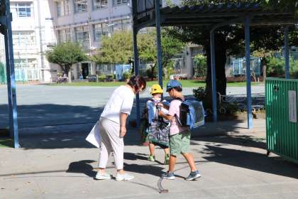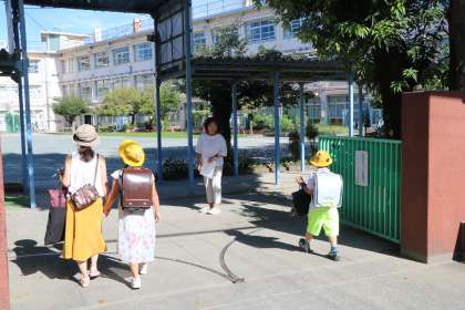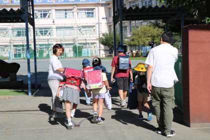 2学期が始まりました。今日は正門で子どもたちを迎えました。