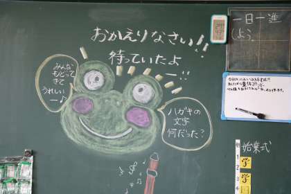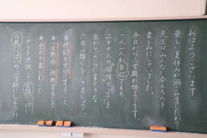 そして8月31日の夕方は、9月1日に子どもたちが気持ちよくスタートできるように教室環境を整えました。クラスの黒板には先生からの熱いメッセージが書いてあるクラスもありました。写真はそのほんの一部です。