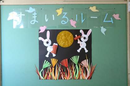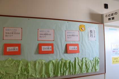 「すまいるルーム」や「ことばの教室」前の掲示板にも季節の掲示物が並びました。早くも秋の気配が・・・