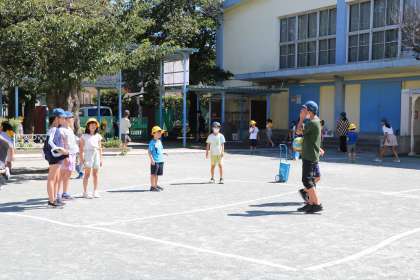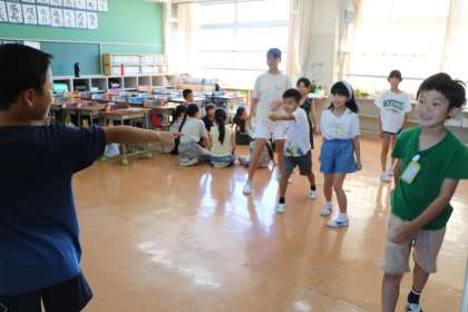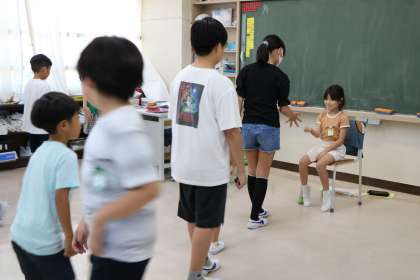 6年生の班長を中心に、だるまさんが転んだ、王様じゃんけんなど楽しんでいます。外で遊ぶ班も水分補給をしたり日陰で休憩したりしながら遊びます。