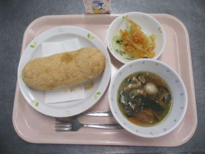 給食室でコッペパンを揚げて、ひとつひとつきなことさとうをまぶして作っています。。パリパリサラダの上にのっているのは、ワンタンの皮を細く切ってから油で揚げたものです。カリカリした食感がおいしいサラダです。