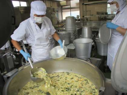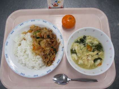 プルコギ丼は韓国の料理です。給食では、生姜、ニンニク、しょうゆ、コチュジャン、さとう、ごま油を合わせたたれに豚肉を漬け込んだ後、にんじん、たまねぎ、もやし、にら、きゃべつと合わせて炒めて作りました。1年生は「少し辛かったけど、とってもおいしかったです。」と教えてくれました。どの学年もよく食べていました。