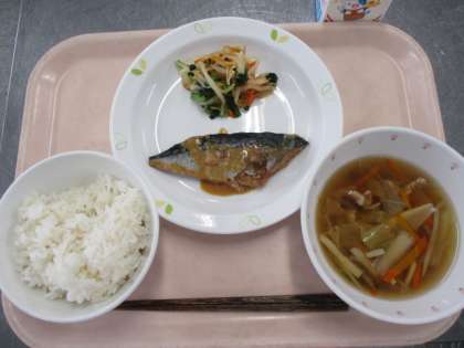 「さわにわん」は「ぐだくさんの汁物」という意味です。鰹節でとっただし汁に、千切りにした豚肉、ごぼう、にんじん、はくさい、ねぎ、干ししいたけ、えのきたけがはいっています。うまみがたっぷりでとてもおいしい汁物です。さばのみそ煮は給食室の大きななべで作りました。臭み消しのためにたっぷりのしょうがとねぎをいれて、煮崩れないようにゆっくりことこと煮ました。おいしいさばのみそ煮ができました。
