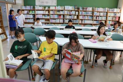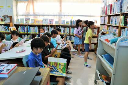 4年生図書の様子です。落ち着いてそれぞれの本を選び読んでいます。時には担任の先生や司書の先生に読みたい本の相談をしています。砧小の図書室は、蔵書は他校と変わりないのですが、部屋が狭くてかわいそうだなと思うこともありましたが、どこにいても読みたい本を真剣に読む砧っこは素晴らしいなと思います。