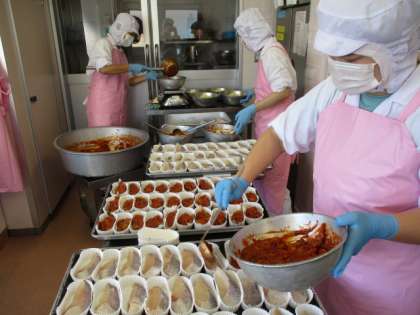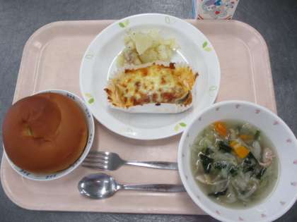 今日の魚はメルルーサです。メルルーサヨーロッパでは古くから親しまれている白身のお魚です。くせがなくあっさりとしていて、タラの味によく似ています。高たんぱく質で低脂肪のお魚です。今日は給食室で、ピザソースを作り、魚を上にかけてオーブンで焼きました。パンに合う魚料理で、こどもたちもよく食べてくれます。