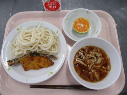 今日のうどんは暑い日でも食べやすいように、給食室でうどんを冷やしていますい。うどんのつゆはかつおぶしとこんぶからだしをとっています。油揚げがたっぷりはいったコクのあるつけつゆにつけて食べます。骨ごと食べられて、カルシウムがしっかりとれるししゃもはからあげにしています。こどもたちは焼きししゃもより、から揚げにしたほうが好きなようです。