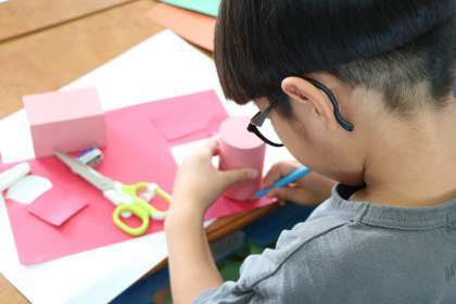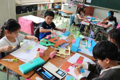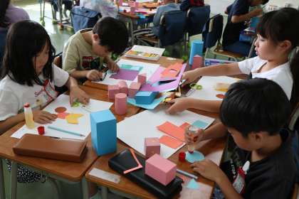 1年生算数「いろいろなかたち」の学習です。カラフルなつみきを鉛筆で写し取りはさみで切っていきます。
