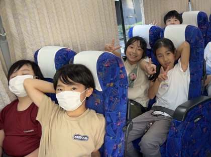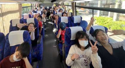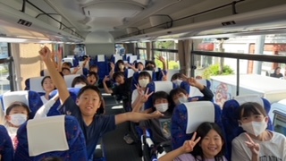 早朝より、多くの保護者の方々のお見送りに感謝申し上げます。バスの中ではみんな元気にバスレクを楽しんでいます。