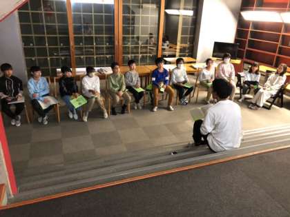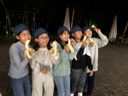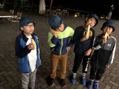 ナイトハイクの後、バナナを食べて、就寝準備です。室長会議では、今日一日の成果と明日への課題が話し合われました。