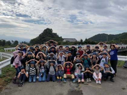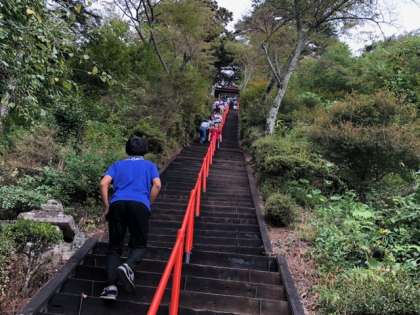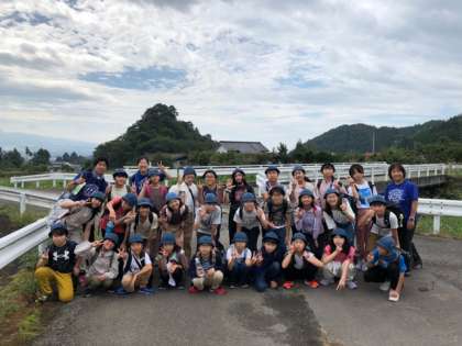 村めぐりの途中、愛宕山で休憩です。集合写真のバックに写っているのが愛宕山です。急階段を登ったら、川場の絶景が見渡せる…そうです。