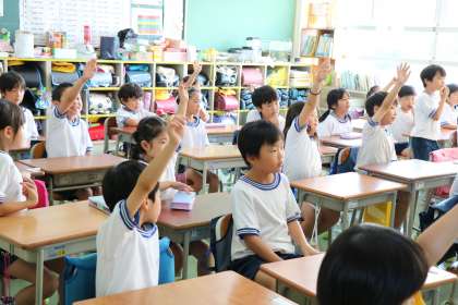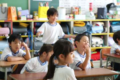 1年生算数・形あてゲームの様子です。4種類の形のヒントをみんなでいい前に出ている友達が手探りでその形を当てます。