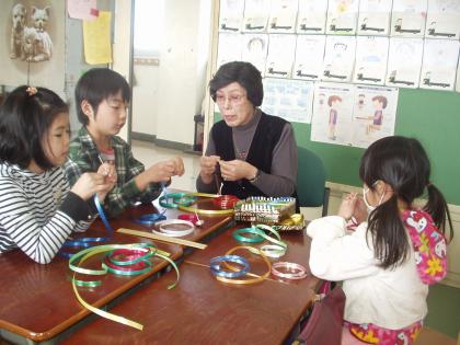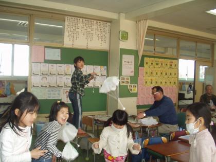 テープごま、パラシュートの作り方を教えていただきました。手先を使う細かい作業に苦戦している子もたくさんいましたが、優しく教えていただき、なんとか出来上がりました。