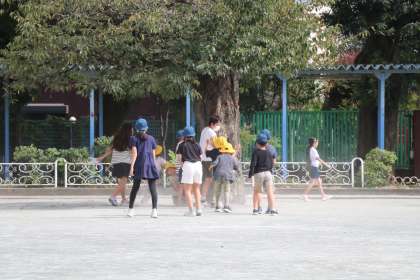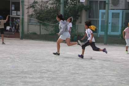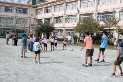 何班か合同で、6年生対そのほかの学年でドッジボールをしたり、だるまさんが転んだをしたり、こおりおにをしたり楽しそうに遊んでいます。