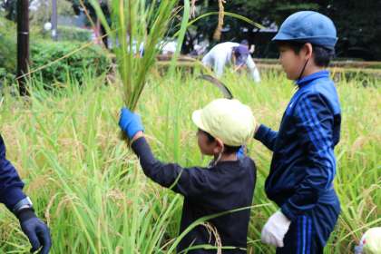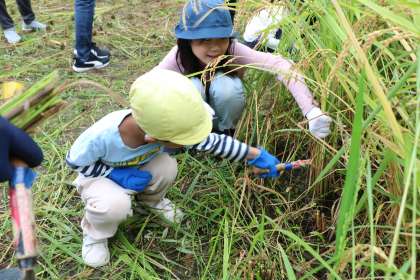 と言いながら、田んぼに入っていきました。幼稚園の子としゃがんでカマを持つと、稲で全く姿が見えなくなるくらい、よく成長している稲穂です。