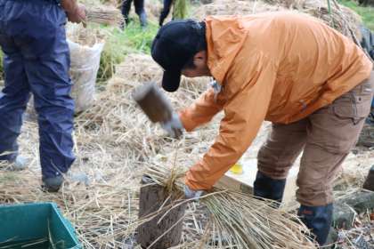 次代夫掘り公園たんぼの一角で昨年度収穫し脱穀した後乾燥させた稲を、ドンドンと叩いている方がいらっしゃいました。まさに、砧小学校校の名前の由来にもなる「きぬた」でその作業をされていました。