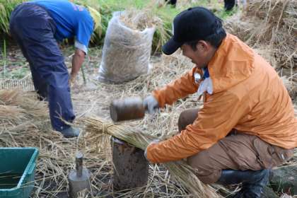 柔らかくして、今日収穫した稲を束ねて縛るために準備しているそうです。