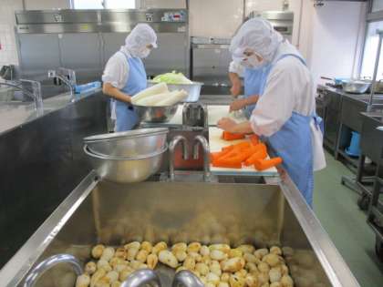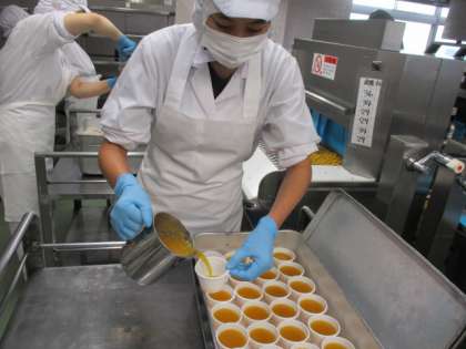豚肉と大根のうま煮は大根のほかにもたくさんの野菜と豚肉が入った煮物です。ショウガ、豚肉、だいこん、にんじん、こんにゃく、里芋、はくさい、うずら卵を大きな給食室の鍋でよく味が染みるまで煮ています。味のしみた煮物を子どもたちはおいしそうに食べていました。残さいもほとんどありませんでした。