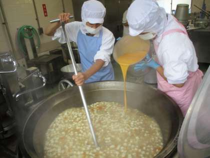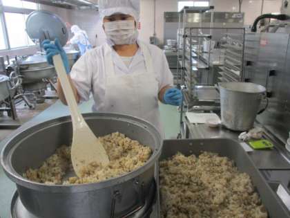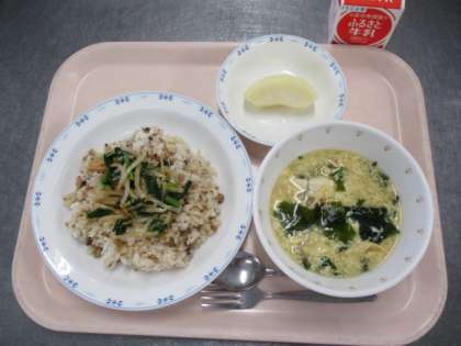 豚肉、ぜんまい、たけのこを甘辛く煮てつくった具とごはんを給食室で混ぜてあるので、教室では、ごはんの上にナムルをのせて混ぜながら食べます。