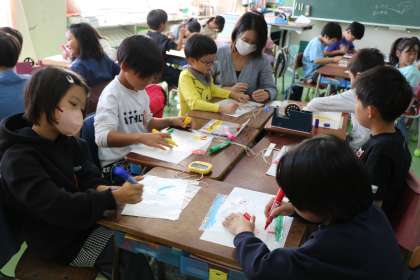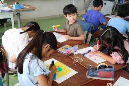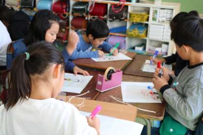 2年生生活科の様子です。久しぶりのお友達も一緒に交流しながら、パラシュートつくりに夢中です。