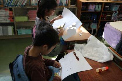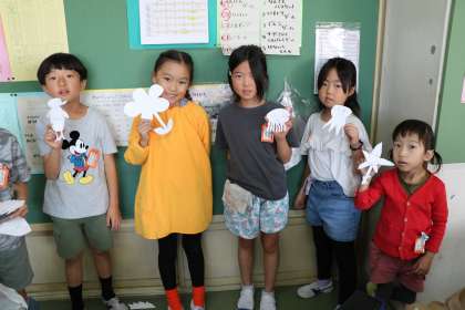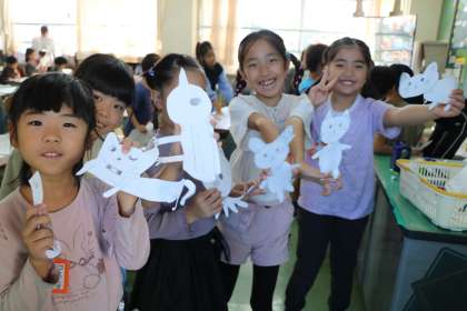 2年生図工「紙はんが」の様子です。型を切り抜いたので先生に見てもらおうと並んでいます。細くて取れやすいところはないかな。細かいところまではさみで切ってあるかな。