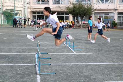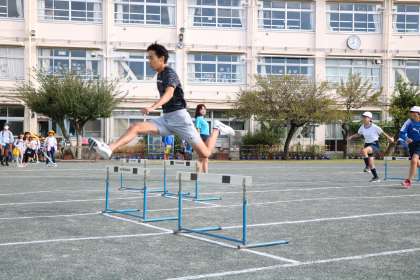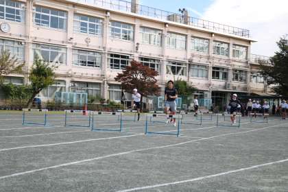 6年生の先生のほかにも応援に来てくれる先生がいるところが、砧小の自慢です。一緒に体を動かしてくれると、子供たちのやる気もぐんとアップします。