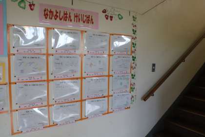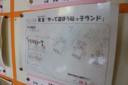 校内にあるなかよし班の掲示板にはそれぞれの班がどのようなおもちゃを作るのかが知らされています。