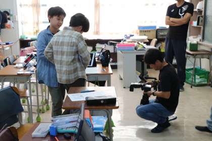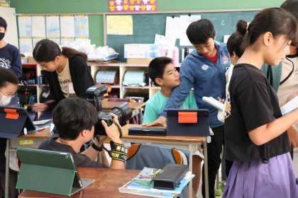 その横で子供たちの様子を写真に収めている方は、カメラマンです。卒業アルバム用に撮影に見えています。