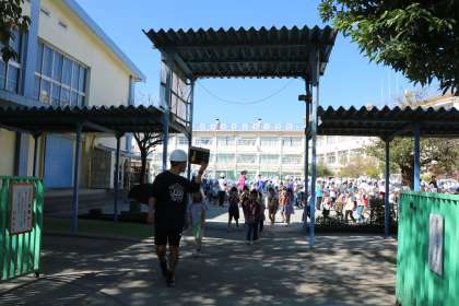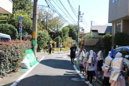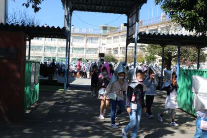 今月の避難訓練がありました。今月は家庭科室からの出火、西階段・昇降口が使えない想定です。校庭の一番西昇降口から遠いところに集合し全員の無事を確認してから、今日は延焼の恐れがあるとして、二次非難をしました。二次避難先は妙法寺さんです。