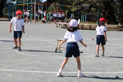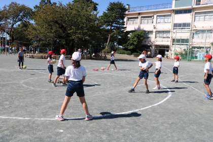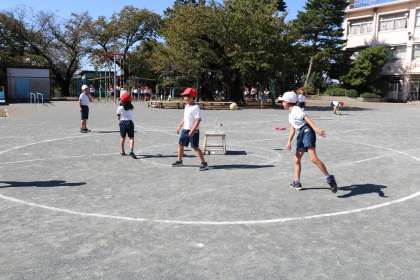 コートが円になっているので、声を掛け合って守らないと的に当てられてしまいます。投げる力はもちろん、チームワークも必要です。