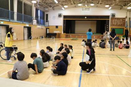 まず全体でお話を聞き、そのあと白杖体験と車いす体験に分かれます。