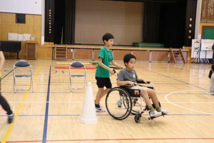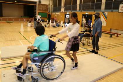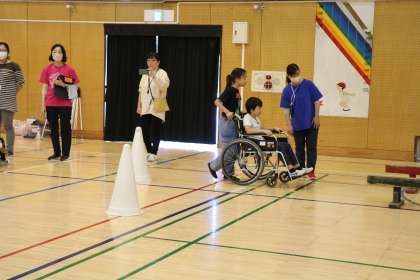 車いす体験の様子です。アップダウンやちょっとした段差のあるコースです。